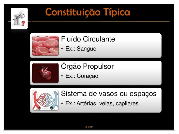 5. 5. Constituição Típica Fluído Circulante • Ex.: Sangue Órgão Propulsor • Ex.: Coração Sistema de vasos ou espaços • Ex.: Artérias, veias, capilares IL 2011