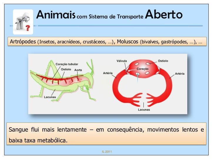 8. 8. Animais com Sistema de Transporte AbertoArtrópodes (Insetos, aracnídeos, crustáceos, …), Moluscos (bivalves, gastrópodes, …), …Sangue flui mais lentamente – em consequência, movimentos lentos ebaixa taxa metabólica. IL 2011