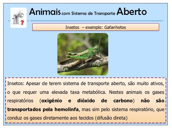 Animais com Sistema de Transporte Aberto                            Insetos – exemplo: GafanhotosInsetos: Apesar de terem ...