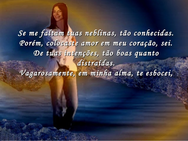 2. 2. Se me faltam tuas neblinas, tão conhecidas. Porém, colocaste amor em meu coração, sei. De tuas intenções, tão boas quanto distraídas. Vagarosamente, em minha alma, te esbocei,