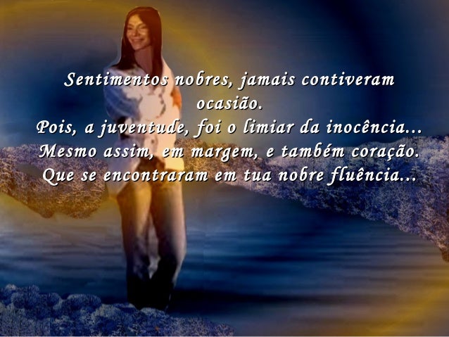 3. 3. Sentimentos nobres, jamais contiveram ocasião. Pois, a juventude, foi o limiar da inocência... Mesmo assim, em margem, e também coração. Que se encontraram em tua nobre fluência...