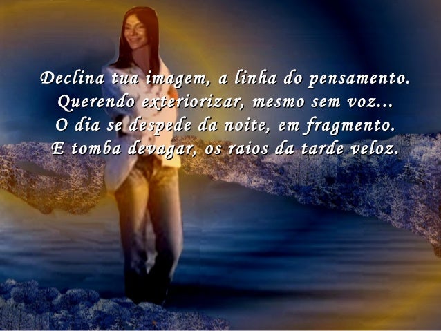 4. 4. Declina tua imagem, a linha do pensamento. Querendo exteriorizar, mesmo sem voz... O dia se despede da noite, em fragmento. E tomba devagar, os raios da tarde veloz.