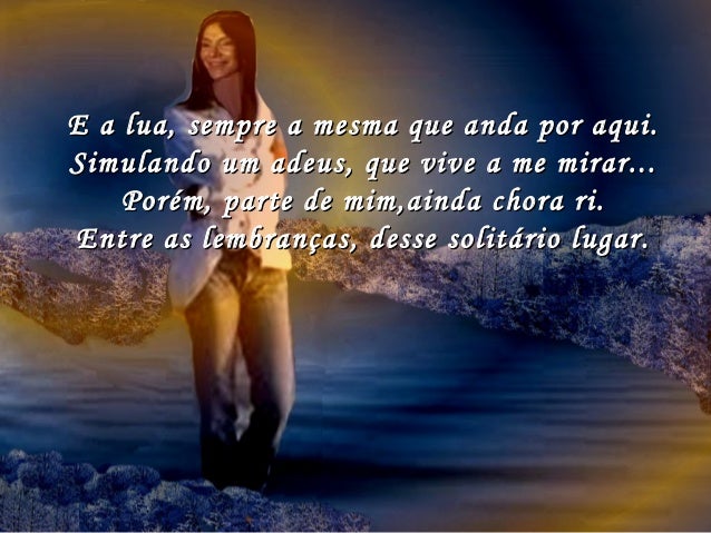 5. 5. E a lua, sempre a mesma que anda por aqui. Simulando um adeus, que vive a me mirar... Porém, parte de mim,ainda chora ri. Entre as lembranças, desse solitário lugar.