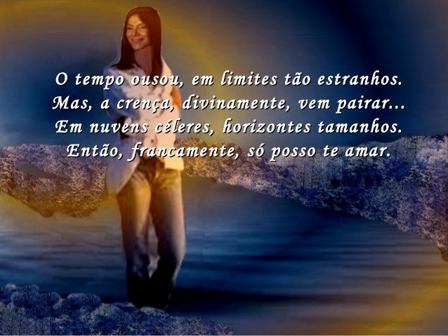 7. 7. O tempo ousou, em limites tão estranhos. Mas, a crença, divinamente, vem pairar... Em nuvens céleres, horizontes tamanhos. Então, francamente, só posso te amar.