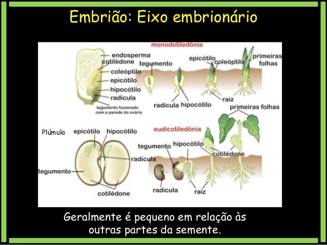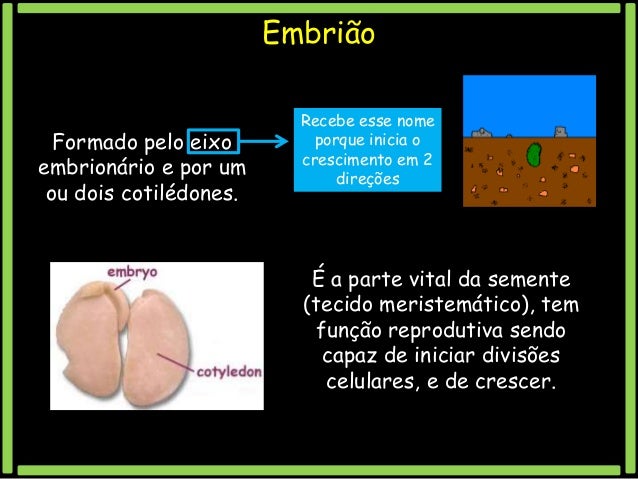 9. 9. Embrião Formado pelo eixo embrionário e por um ou dois cotilédones. Recebe esse nome porque inicia o crescimento em 2 direções É a parte vital da semente (tecido meristemático), tem função reprodutiva sendo capaz de iniciar divisões celulares, e de crescer.