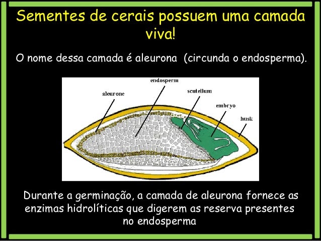 17. 17. Sementes de cerais possuem uma camada viva! O nome dessa camada é aleurona (circunda o endosperma). Durante a germinação, a camada de aleurona fornece as enzimas hidrolíticas que digerem as reserva presentes no endosperma