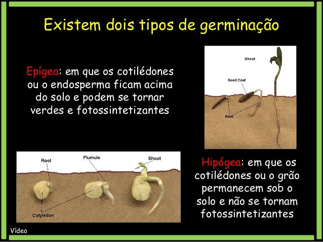 18. 18. Existem dois tipos de germinação Epígea: em que os cotilédones ou o endosperma ficam acima do solo e podem se tornar verdes e fotossintetizantes Hipógea: em que os cotilédones ou o grão permanecem sob o solo e não se tornam fotossintetizantes Vídeo