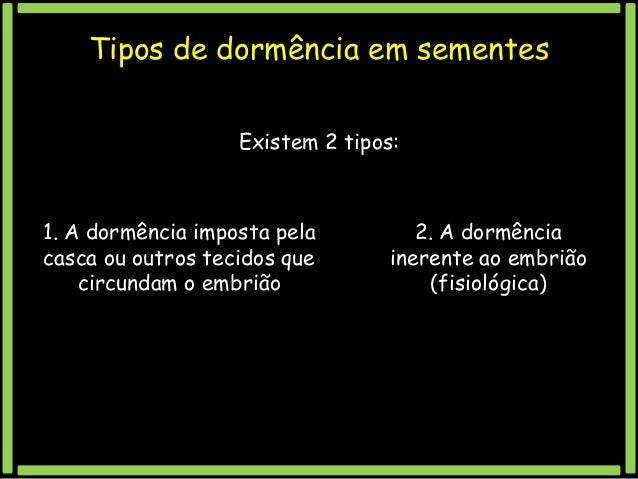 20. 20. Tipos de dormência em sementes Existem 2 tipos: 1. A dormência imposta pela casca ou outros tecidos que circundam o embrião 2. A dormência inerente ao embrião (fisiológica)
