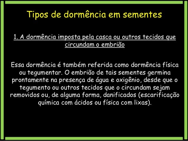 21. 21. Tipos de dormência em sementes 1. A dormência imposta pela casca ou outros tecidos que circundam o embrião Essa dormência é também referida como dormência física ou tegumentar. O embrião de tais sementes germina prontamente na presença de água e oxigênio, desde que o tegumento ou outros tecidos que o circundam sejam removidos ou, de alguma forma, danificados (escarificação química com ácidos ou física com lixas).