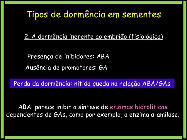 23. 23. Tipos de dormência em sementes 2. A dormência inerente ao embrião (fisiológica) Presença de inibidores: ABA Ausência de promotores: GA Perda da dormência: nítida queda na relação ABA/GAs ABA: parece inibir a síntese de enzimas hidrolíticas dependentes de GAs, como por exemplo, a enzima α-amilase.