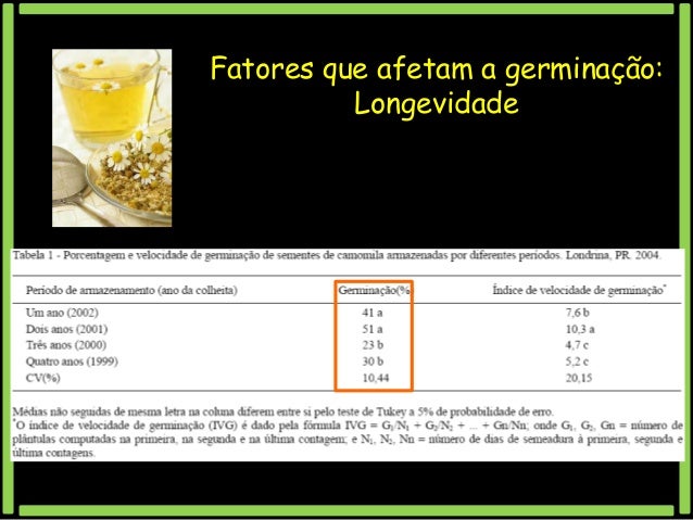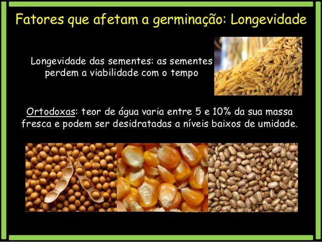 24. 24. Fatores que afetam a germinação: Longevidade Longevidade das sementes: as sementes perdem a viabilidade com o tempo Ortodoxas: teor de água varia entre 5 e 10% da sua massa fresca e podem ser desidratadas a níveis baixos de umidade.