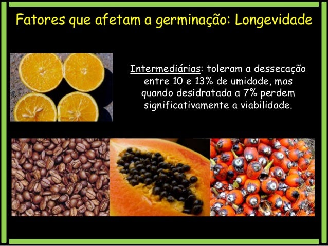 25. 25. Fatores que afetam a germinação: Longevidade Intermediárias: toleram a dessecação entre 10 e 13% de umidade, mas quando desidratada a 7% perdem significativamente a viabilidade.
