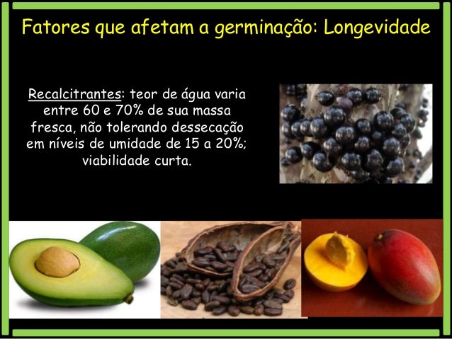 26. 26. Fatores que afetam a germinação: Longevidade Recalcitrantes: teor de água varia entre 60 e 70% de sua massa fresca, não tolerando dessecação em níveis de umidade de 15 a 20%; viabilidade curta.