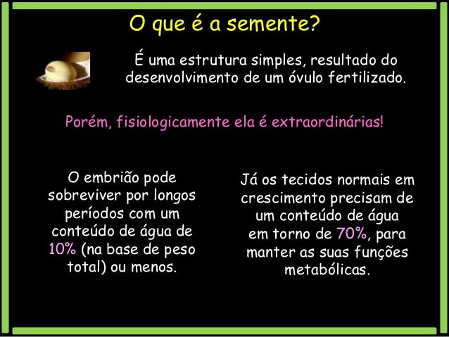 3. 3. O que é a semente? É uma estrutura simples, resultado do desenvolvimento de um óvulo fertilizado. Porém, fisiologicamente ela é extraordinárias! O embrião pode sobreviver por longos períodos com um conteúdo de água de 10% (na base de peso total) ou menos. Já os tecidos normais em crescimento precisam de um conteúdo de água em torno de 70%, para manter as suas funções metabólicas.