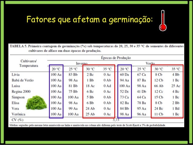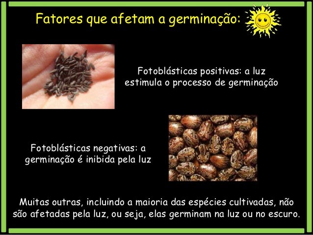 32. 32. Fatores que afetam a germinação: Fotoblásticas positivas: a luz estimula o processo de germinação Fotoblásticas negativas: a germinação é inibida pela luz Muitas outras, incluindo a maioria das espécies cultivadas, não são afetadas pela luz, ou seja, elas germinam na luz ou no escuro.