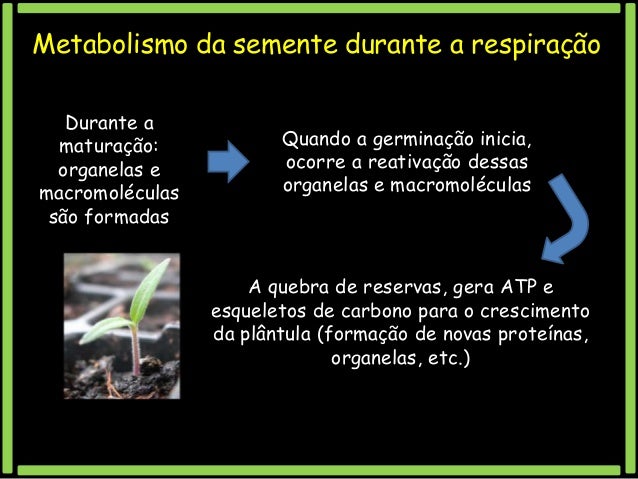 33. 33. Metabolismo da semente durante a respiração Durante a maturação: organelas e macromoléculas são formadas Quando a germinação inicia, ocorre a reativação dessas organelas e macromoléculas A quebra de reservas, gera ATP e esqueletos de carbono para o crescimento da plântula (formação de novas proteínas, organelas, etc.)