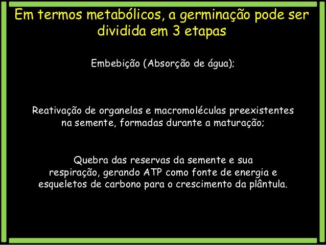 34. 34. Em termos metabólicos, a germinação pode ser dividida em 3 etapas Embebição (Absorção de água); Reativação de organelas e macromoléculas preexistentes na semente, formadas durante a maturação; Quebra das reservas da semente e sua respiração, gerando ATP como fonte de energia e esqueletos de carbono para o crescimento da plântula.