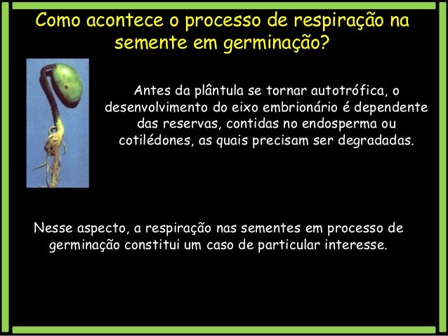 35. 35. Como acontece o processo de respiração na semente em germinação? Antes da plântula se tornar autotrófica, o desenvolvimento do eixo embrionário é dependente das reservas, contidas no endosperma ou cotilédones, as quais precisam ser degradadas. Nesse aspecto, a respiração nas sementes em processo de germinação constitui um caso de particular interesse.