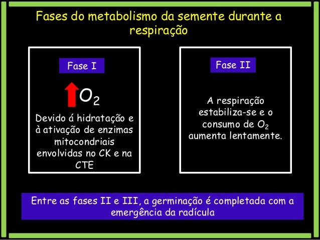 36. 36. Fases do metabolismo da semente durante a respiração Fase I O2 Devido á hidratação e à ativação de enzimas mitocondriais envolvidas no CK e na CTE Fase II A respiração estabiliza-se e o consumo de O2 aumenta lentamente. Entre as fases II e III, a germinação é completada com a emergência da radícula