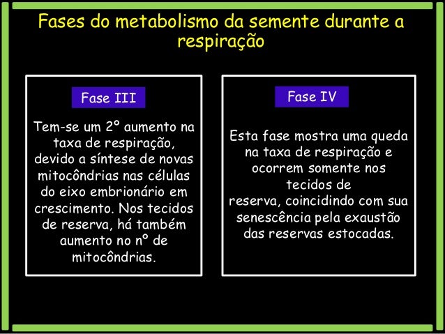 37. 37. Fases do metabolismo da semente durante a respiração Fase III Tem-se um 2º aumento na taxa de respiração, devido a síntese de novas mitocôndrias nas células do eixo embrionário em crescimento. Nos tecidos de reserva, há também aumento no nº de mitocôndrias. Fase IV Esta fase mostra uma queda na taxa de respiração e ocorrem somente nos tecidos de reserva, coincidindo com sua senescência pela exaustão das reservas estocadas.