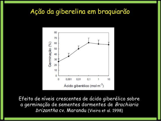 39. 39. Ação da giberelina em braquiarão Efeito de níveis crescentes de ácido giberélico sobre a germinação de sementes dormentes de Brachiaria brizantha cv. Marandu (Vieira et al. 1998)