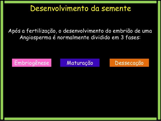 4. 4. Desenvolvimento da semente Após a fertilização, o desenvolvimento do embrião de uma Angiosperma é normalmente dividido em 3 fases: Embriogênese Maturação Dessecação