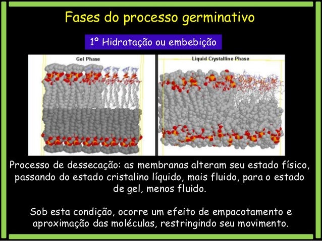42. 42. Fases do processo germinativo 1º Hidratação ou embebição Processo de dessecação: as membranas alteram seu estado físico, passando do estado cristalino líquido, mais fluido, para o estado de gel, menos fluido. Sob esta condição, ocorre um efeito de empacotamento e aproximação das moléculas, restringindo seu movimento.