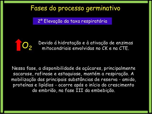 43. 43. Fases do processo germinativo 2º Elevação da taxa respiratória O2 Devido á hidratação e à ativação de enzimas mitocondriais envolvidas no CK e na CTE. Nessa fase, a disponibilidade de açúcares, principalmente sacarose, rafinose e estaquiose, mantém a respiração. A mobilização das principais substâncias de reserva - amido, proteínas e lipídios - ocorre após o início do crescimento do embrião, na fase III da embebição.