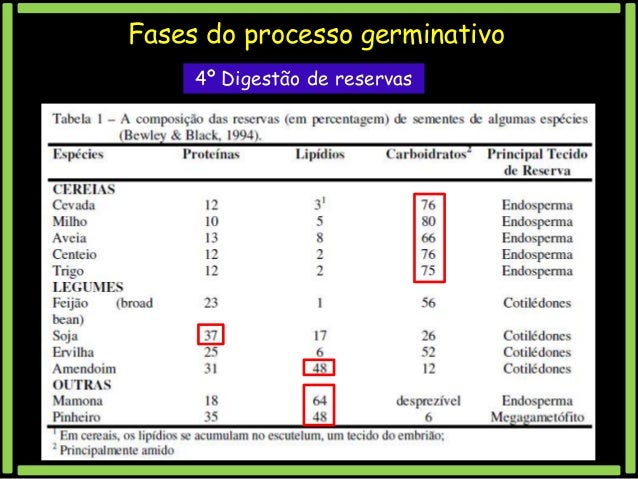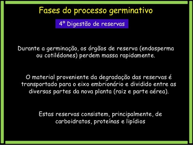 45. 45. Fases do processo germinativo 4º Digestão de reservas Durante a germinação, os órgãos de reserva (endosperma ou cotilédones) perdem massa rapidamente. O material proveniente da degradação das reservas é transportado para o eixo embrionário e dividido entre as diversas partes da nova planta (raiz e parte aérea). Estas reservas consistem, principalmente, de carboidratos, proteínas e lipídios