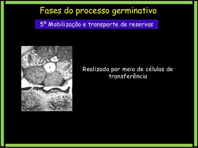 47. 47. Fases do processo germinativo 5º Mobilização e transporte de reservas Realizada por meio de células de transferência