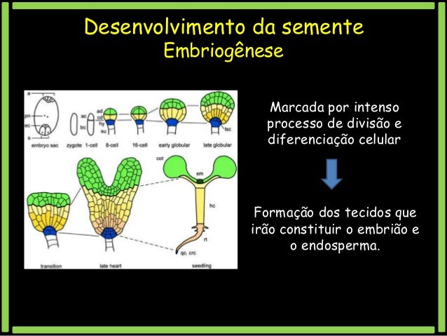 5. 5. Desenvolvimento da semente Embriogênese Marcada por intenso processo de divisão e diferenciação celular Formação dos tecidos que irão constituir o embrião e o endosperma.