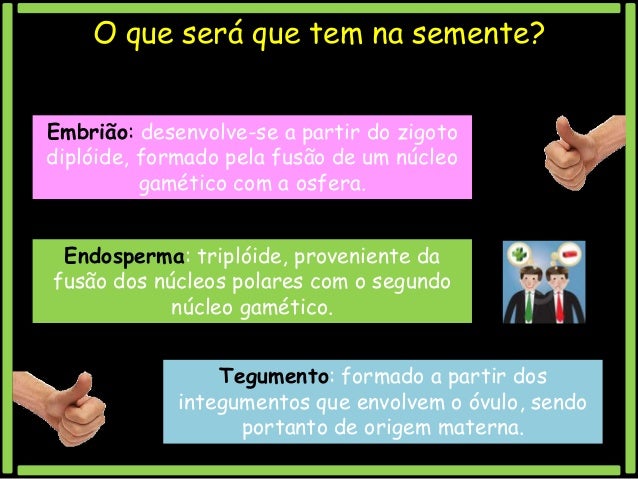 8. 8. O que será que tem na semente? Embrião: desenvolve-se a partir do zigoto diplóide, formado pela fusão de um núcleo gamético com a osfera. Endosperma: triplóide, proveniente da fusão dos núcleos polares com o segundo núcleo gamético. Tegumento: formado a partir dos integumentos que envolvem o óvulo, sendo portanto de origem materna.