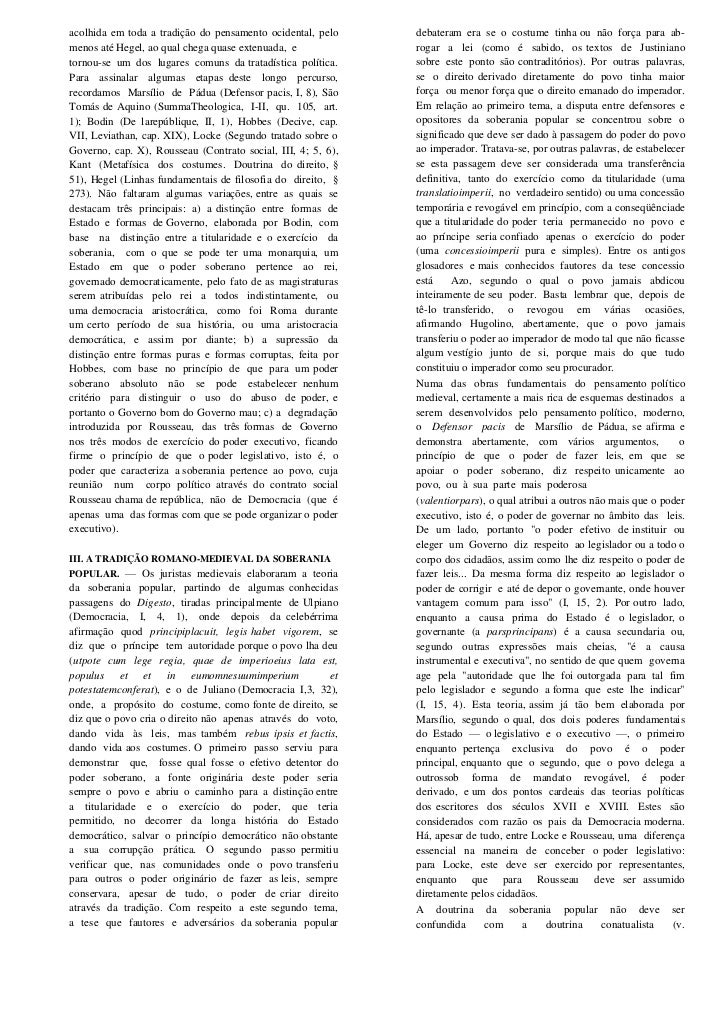 2. 2. acolhida em toda a tradição do pensamento ocidental, pelo debateram era se o costume tinha ou não força para ab-menos até Hegel, ao qual chega quase extenuada, e rogar a lei (como é sabido, os textos de Justinianotornou-se um dos lugares comuns da tratadística política. sobre este ponto são contraditórios). Por outras palavras,Para assinalar algumas etapas deste longo percurso, se o direito derivado diretamente do povo tinha maiorrecordamos Marsílio de Pádua (Defensor pacis, I, 8), São força ou menor força que o direito emanado do imperador.Tomás de Aquino (SummaTheologica, I-II, qu. 105, art. Em relação ao primeiro tema, a disputa entre defensores e1); Bodin (De larepúblique, II, 1), Hobbes (Decive, cap. opositores da soberania popular se concentrou sobre oVII, Leviathan, cap. XIX), Locke (Segundo tratado sobre o significado que deve ser dado à passagem do poder do povoGoverno, cap. X), Rousseau (Contrato social, III, 4; 5, 6), ao imperador. Tratava-se, por outras palavras, de estabelecerKant (Metafísica dos costumes. Doutrina do direito, § se esta passagem deve ser considerada uma transferência51), Hegel (Linhas fundamentais de filosofia do direito, § definitiva, tanto do exercício como da titularidade (uma273). Não faltaram algumas variações, entre as quais se translatioimperii, no verdadeiro sentido) ou uma concessãodestacam três principais: a) a distinção entre formas de temporária e revogável em princípio, com a conseqüênciadeEstado e formas de Governo, elaborada por Bodin, com que a titularidade do poder teria permanecido no povo ebase na distinção entre a titularidade e o exercício da ao príncipe seria confiado apenas o exercício do podersoberania, com o que se pode ter uma monarquia, um (uma concessioimperii pura e simples). Entre os antigosEstado em que o poder soberano pertence ao rei, glosadores e mais conhecidos fautores da tese concessiogovernado democraticamente, pelo fato de as magistraturas está Azo, segundo o qual o povo jamais abdicouserem atribuídas pelo rei a todos indistintamente, ou inteiramente de seu poder. Basta lembrar que, depois deuma democracia aristocrática, como foi Roma durante tê-lo transferido, o revogou em várias ocasiões,um certo período de sua história, ou uma aristocracia afirmando Hugolino, abertamente, que o povo jamaisdemocrática, e assim por diante; b) a supressão da transferiu o poder ao imperador de modo tal que não ficassedistinção entre formas puras e formas corruptas, feita por algum vestígio junto de si, porque mais do que tudoHobbes, com base no princípio de que para um poder constituiu o imperador como seu procurador.soberano absoluto não se pode estabelecer nenhum Numa das obras fundamentais do pensamento políticocritério para distinguir o uso do abuso de poder, e medieval, certamente a mais rica de esquemas destinados aportanto o Governo bom do Governo mau; c) a degradação serem desenvolvidos pelo pensamento político, moderno,introduzida por Rousseau, das três formas de Governo o Defensor pacis de Marsílio de Pádua, se afirma enos três modos de exercício do poder executivo, ficando demonstra abertamente, com vários argumentos, ofirme o princípio de que o poder legislativo, isto é, o princípio de que o poder de fazer leis, em que sepoder que caracteriza a soberania pertence ao povo, cuja apoiar o poder soberano, diz respeito unicamente aoreunião num corpo político através do contrato social povo, ou à sua parte mais poderosaRousseau chama de república, não de Democracia (que é (valentiorpars), o qual atribui a outros não mais que o poderapenas uma das formas com que se pode organizar o poder executivo, isto é, o poder de governar no âmbito das leis.executivo). De um lado, portanto "o poder efetivo de instituir ou eleger um Governo diz respeito ao legislador ou a todo oIII. A TRADIÇÃO ROMANO-MEDIEVAL DA SOBERANIA corpo dos cidadãos, assim como lhe diz respeito o poder dePOPULAR. — Os juristas medievais elaboraram a teoria fazer leis... Da mesma forma diz respeito ao legislador oda soberania popular, partindo de algumas conhecidas poder de corrigir e até de depor o governante, onde houverpassagens do Digesto, tiradas principalmente de Ulpiano vantagem comum para isso" (I, 15, 2). Por outro lado,(Democracia, I, 4, 1), onde depois da celebérrima enquanto a causa prima do Estado é o legislador, oafirmação quod principiplacuit, legis habet vigorem, se governante (a parsprincipans) é a causa secundaria ou,diz que o príncipe tem autoridade porque o povo lha deu segundo outras expressões mais cheias, "é a causa(utpote cum lege regia, quae de imperioeius lata est, instrumental e executiva", no sentido de que quem governapopulus et et in eumomnesuumimperium et age pela "autoridade que lhe foi outorgada para tal fimpotestatemconferat), e o de Juliano (Democracia I,3, 32), pelo legislador e segundo a forma que este lhe indicar"onde, a propósito do costume, como fonte de direito, se (I, 15, 4). Esta teoria, assim já tão bem elaborada pordiz que o povo cria o direito não apenas através do voto, Marsílio, segundo o qual, dos dois poderes fundamentaisdando vida às leis, mas também rebus ipsis et factis, do Estado — o legislativo e o executivo —, o primeirodando vida aos costumes. O primeiro passo serviu para enquanto pertença exclusiva do povo é o poderdemonstrar que, fosse qual fosse o efetivo detentor do principal, enquanto que o segundo, que o povo delega apoder soberano, a fonte originária deste poder seria outrossob forma de mandato revogável, é podersempre o povo e abriu o caminho para a distinção entre derivado, e um dos pontos cardeais das teorias políticasa titularidade e o exercício do poder, que teria dos escritores dos séculos XVII e XVIII. Estes sãopermitido, no decorrer da longa história do Estado considerados com razão os pais da Democracia moderna.democrático, salvar o princípio democrático não obstante Há, 