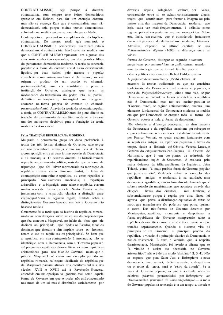 3. 3. CONTRATUALISMO), seja porque a doutrina diversos órgãos colegiados, embora, por vezes,contratualista nem sempre teve êxitos democráticos contrastando entre si, se acham constantemente alguns(pense-se em Hobbes, para dar um exemplo comum, traços que contribuíram para formar a imagem ou pelomas não se esqueça Kant que é contratualista mas não menos uma das imagens da Democracia moderna, quedemocrático), seja porque muitas teorias democráticas, hoje, cada vez mais freqüentemente, é definida comosobretudo na medida em que se caminha para a Idade regime policráticooposto ao regime monocrático. SobreContemporânea, prescindem completamente da hipótese esta linha, um escritor, que é considerado justamentecontratualista. Do mesmo modo que nem todo o como um precursor do democratismo moderno, JohannesCONTRATUALISMO é democrático, assim nem todo o Althusius, expondo no último capítulo de suademocratismo é contratualista. Isto é certo na medida em Políticmethodice digesta (1603), a diferença entre asque o CONTRATUALISMO representa, em algumas das váriassuas mais conhecidas expressões, um dos grandes filões formas de Governo, distingue-as segundo o summusdo pensamento democrático moderno. A teoria da soberania magistratus por monarchicus ou poliarchicus, usandopopular e a teoria do contrato social estão estreitamente uma terminologia que se tornará familiar para aligados, por duas razões, pelo menos: o populus ciência política americana com Robert Dahl, o qual noconcebido como universitascivium é ele mesmo, na sua A prefacetodemocratictheory (1956) elabora, deorigem, o produto de um acordo (o chamado encontro às teorias tradicionais ou que ele considerapactumsocietatis); uma vez constituído o povo, a tradicionais, da Democracia madisoniana e populista, ainstituição do Governo, quaisquer que sejam as teoria da Polyarchaldemocracy. Ainda uma vez, se pormodalidades da transmissão do poder, total ou parcial, Democracia se entende a forma aristotélica, a repúblicadefinitivo ou temporário, irrevogável ou revogável, não é Democracia; mas no seu caráter peculiar deacontece na forma própria de contrato (o chamado "Governo livre", de regime antiautocrático, encerra umpactumsubjectionis). Através da teoria da soberania popular, elemento fundamental da Democracia moderna na medidaa teoria do CONTRATUALISMO entra de pleno direito na em que por Democracia se entende toda a forma detradição do pensamento democrático moderno e torna-se Governo oposta a toda a forma de despotismo.um dos momentos decisivos para a fundação da teoria Não obstante a diferença conceptual, as duas imagensmoderna da democracia. da Democracia e da república terminam por sobrepor-se e por confundir-se nos escritores estudados recentementeIV. A TRADIÇÃO REPUBLICANA MODERNA. por Franco Venturi, os quais exaltam, juntamente comMalgrado o pensamento grego ter dado preferência à as repúblicas antigas, as repúblicas pequenas e livres doteoria das três formas distintas de Governo, sabe-se que tempo, desde a Holanda até Gênova, Veneza, Lucca, eele não desconhece, como já vimos nas Leis de Platão, Genebra do citoyenvirtueuxJean-Jacques. O Oceana dea contraposição entre as duas formas opostas da Democracia Harrington, que é um dos pontos de referência doe da monarquia. O desenvolvimento da história romana republicanismo inglês de Setecentos, é exaltada pelorepropõe ao pensamento político, mais do que o tema da maior defensor da idéiarepublicana da Inglaterra, Johntripartição (que foi talvez representado na teorização da Toland, como "a mais perfeita forma de Governo popularrepública romana como Governo misto), o tema da que jamais existiu". Modelada sobre o exemplo dascontraposição entre reino e república, ou entre república e repúblicas antigas e modernas, é, na realidade, umaprincipado. Nos escritores medievais, a tripartição democracia igualitária, não só formalmente, fundada que éaristotélica e a bipartição entre reino e república correm sobre a rotação das magistraturas que acontece através dasmuitas vezes de forma paralela: Santo Tomás acolhe eleições livres dos cidadãos, mas também, ejuntamente com a tripartição clássica a distinção entre substancialmente, porque é regida por uma férrea leiregimenpoliticum et regimen regale, fundada sobre a agrária, que prevê a distribuição eqüitativa de terras dedistinção entre Governo baseado nas leis e Governo não modo que ninguém seja tão poderoso que possa oprimirbaseado nas leis. o outro. Das três formas de Governo descritas porCertamente foi a meditação da história da república romana, Montesquieu, república, monarquia e despotismo, aunida às considerações sobre as coisas do próprio tempo, forma republicana de Governo compreende tanto aque fez escrever a Maquiavel, no início da obra que ele república democrática como a aristocrática, quase semprededicou ao principado, que "todos os Estados, todos os tratadas separadamente. Quando o discurso visa osdomínios que tiveram e têm império sobre os homens, princípios de um Governo, o princípio próprio daforam e são ou repúblicas ou principados". Se bem que república, a virtude, é o princípio clássico da Democracia ea república, em sua contraposição à monarquia, não se não da aristocracia. E tanto é verdade, que, a respeitoidentifique com a Democracia, com o "Governo popular", da aristocracia, Montesquieu foi levado a afirmar que seaté porque nas repúblicas democráticas existem repúblicas "a virtude é assim tão necessária no Governoaristocráticas (para não falar do Governo misto que o aristocrático", não o é de um modo "absoluto" (I, 3, 4). Nãopróprio Maquiavel vê como um exemplo perfeito na se esqueça que para Saint Just e Robespierre a novarepública romana), na noção idealizada da república que democracia que varrerá, definitivamente, o despotismode Maquiavel passará através