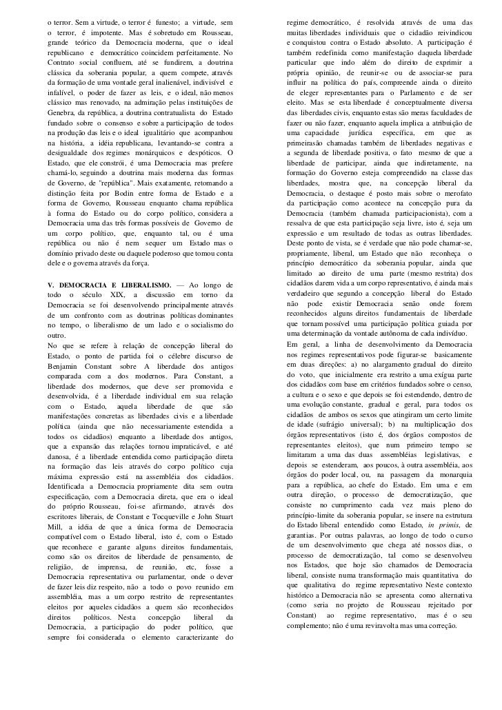4. 4. o terror. Sem a virtude, o terror é funesto; a virtude, sem regime democrático, é resolvida através de uma daso terror, é impotente. Mas é sobretudo em Rousseau, muitas liberdades individuais que o cidadão reivindicougrande teórico da Democracia moderna, que o ideal e conquistou contra o Estado absoluto. A participação érepublicano e democrático coincidem perfeitamente. No também redefinida como manifestação daquela liberdadeContrato social confluem, até se fundirem, a doutrina particular que indo além do direito de exprimir aclássica da soberania popular, a quem compete, através própria opinião, de reunir-se ou de associar-se parada formação de uma vontade geral inalienável, indivisível e influir na política do país, compreende ainda o direitoinfalível, o poder de fazer as leis, e o ideal, não menos de eleger representantes para o Parlamento e de serclássico mas renovado, na admiração pelas instituições de eleito. Mas se esta liberdade é conceptualmente diversaGenebra, da república, a doutrina contratualista do Estado das liberdades civis, enquanto estas são meras faculdades defundado sobre o consenso e sobre a participação de todos fazer ou não fazer, enquanto aquela implica a atribuição dena produção das leis e o ideal igualitário que acompanhou uma capacidade jurídica específica, em que asna história, a idéia republicana, levantando-se contra a primeirasão chamadas também de liberdades negativas edesigualdade dos regimes monárquicos e despóticos. O a segunda de liberdade positiva, o fato mesmo de que aEstado, que ele constrói, é uma Democracia mas prefere liberdade de participar, ainda que indiretamente, nachamá-lo, seguindo a doutrina mais moderna das formas formação do Governo esteja compreendido na classe dasde Governo, de "república". Mais exatamente, retomando a liberdades, mostra que, na concepção liberal dadistinção feita por Bodin entre forma de Estado e a Democracia, o destaque é posto mais sobre o merofatoforma de Governo, Rousseau enquanto chama república da participação como acontece na concepção pura daà forma do Estado ou do corpo político, considera a Democracia (também chamada participacionista), com aDemocracia uma das três formas possíveis de Governo de ressalva de que esta participação seja livre, isto é, seja umum corpo político, que, enquanto tal, ou é uma expressão e um resultado de todas as outras liberdades.república ou não é nem sequer um Estado mas o Deste ponto de vista, se é verdade que não pode chamar-se,domínio privado deste ou daquele poderoso que tomou conta propriamente, liberal, um Estado que não reconheça odele e o governa através da força. princípio democrático da soberania popular, ainda que limitado ao direito de uma parte (mesmo restrita) dosV. DEMOCRACIA E LIBERALISMO. — Ao longo de cidadãos darem vida a um corpo representativo, é ainda maistodo o século XIX, a discussão em torno da verdadeiro que segundo a concepção liberal do EstadoDemocracia se foi desenvolvendo principalmente através não pode existir Democracia senão onde foremde um confronto com as doutrinas políticas dominantes reconhecidos alguns direitos fundamentais de liberdadeno tempo, o liberalismo de um lado e o socialismo do que tornam possível uma participação política guiada poroutro. uma determinação da vontade autônoma de cada indivíduo.No que se refere à relação de concepção liberal do Em geral, a linha de desenvolvimento da DemocraciaEstado, o ponto de partida foi o célebre discurso de nos regimes representativos pode figurar-se basicamenteBenjamin Constant sobre A liberdade dos antigos em duas direções: a) no alargamento gradual do direitocomparada com a dos modernos. Para Constant, a do voto, que inicialmente era restrito a uma exígua parteliberdade dos modernos, que deve ser promovida e dos cidadãos com base em critérios fundados sobre o censo,desenvolvida, é a liberdade individual em sua relação a cultura e o sexo e que depois se foi estendendo, dentro decom o Estado, aquela liberdade de que são uma evolução constante, gradual e geral, para todos osmanifestações concretas as liberdades civis e a liberdade cidadãos de ambos os sexos que atingiram um certo limitepolítica (ainda que não necessariamente estendida a de idade (sufrágio universal); b) na multiplicação dostodos os cidadãos) enquanto a liberdade dos antigos, órgãos representativos (isto é, dos órgãos compostos deque a expansão das relações tornou impraticável, e até representantes eleitos), que num primeiro tempo sedanosa, é a liberdade entendida como participação direta limitaram a uma das duas assembléias legislativas, ena formação das leis através do corpo político cuja depois se estenderam, aos poucos, à outra assembléia, aosmáxima expressão está na assembléia dos cidadãos. órgãos do poder local, ou, na passagem da monarquiaIdentificada a Democracia propriamente dita sem outra para a república, ao chefe do Estado. Em uma e emespecificação, com a Democracia direta, que era o ideal outra direção, o processo de democratização, quedo próprio Rousseau, foi-se afirmando, através dos consiste no cumprimento cada vez mais pleno doescritores liberais, de Constant e Tocqueville e John Stuart princípio-limite da soberania popular, se insere na estruturaMill, a idéia de que a única forma de Democracia do Estado liberal entendido como Estado, in primis, decompatível com o Estado liberal, isto é, com o Estado garantias. Por outras palavras, ao longo de todo o cursoque reconhece e garante alguns direitos fundamentais, de um desenvolvimento que chega até nossos dias, ocomo são os direitos de liberdade de pensamento, de processo de democratização, tal como se desenvolveureligião, de imprensa, de reunião, etc, fosse a nos Estados, que hoje são chamados de DemocraciaDemocracia representativa ou parlamentar, onde o dever liberal, consiste n