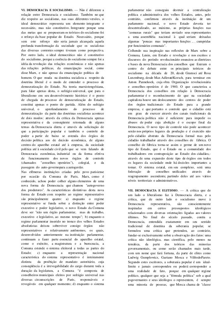 5. 5. VI. DEMOCRACIA E SOCIALISMO. — Não é diferente a parlamentar não conseguiu destruir a centralizaçãorelação entre Democracia e socialismo. Também no que política e administrativa dos velhos Estados, antes, pelodiz respeito ao socialismo, nas suas diferentes versões, o contrário, confirmou através da instituição de umideal democrático representa um elemento integrante e parlamento nacional, o novo Estado deveria ternecessário, mas não constitutivo. Integrante porque uma descentralizado, ao máximo, as próprias funções nasdas metas que se propuseram os teóricos do socialismo foi "comunas rurais" que teriam enviado seus representanteso reforço da base popular do Estado. Necessário, porque a uma assembléia nacional à qual seriam deixadassem este reforço não seria jamais alcançada aquela algumas "poucas mas importantes funções .. . cumpridasprofunda transformação da sociedade que os socialistas por funcionários comunais".das diversas correntes sempre tiveram como perspectiva. Colhendo sua inspiração nas reflexões de Marx sobre aPor outro lado, o ideal democrático não é constitutivo Comuna, Lenin, em Estado e revolução e nos escritos edo socialismo, porque a essência do socialismo sempre foi a discursos do período revolucionário enunciou as diretrizesidéia da revolução das relações econômicas e não apenas e bases da nova Democracia dos conselhos que fizeram odas relações políticas, da emancipação social, como centro do debate entre os principais teóricos dodisse Marx, e não apenas da emancipação política do socialismo na década de 20, desde Gramsci até Rosahomem. O que muda na doutrina socialista a respeito da Luxemburg, desde Max AdleratéKorsch, para terminar emdoutrina liberal é o modo de entender o processo de Anton Pannekoek, cuja obra Organização revolucionáriademocratização do Estado. Na teoria marxistengelsiana, e conselhos operários é de 1940. O que caracteriza apara falar apenas desta, o sufrágio universal, que para o Democracia dos conselhos em relação à Democracialiberalismo em seu desenvolvimento histórico é o ponto parlamentar é o reconhecimento de que na sociedadede chegada do processo de democratização do Estado, capitalista houve um deslocamento dos centros de poderconstitui apenas o ponto de partida. Além do sufrágio dos órgãos tradicionais do Estado para a grandeuniversal, o aprofundamento do processo de empresa, e que portanto o controle que o cidadão estádemocratização da parte das doutrinas socialistas acontece em grau de exercer através dos canais tradicionais dade dois modos: através da crítica da Democracia apenas Democracia política não é suficiente para impedir osrepresentativa e da conseqüente retomada de alguns abusos de poder cuja abolição é o escopo final datemas da Democracia direta e através da solicitação de Democracia. O novo tipo de controle não pode acontecerque a participação popular e também o controle do senão nos próprios lugares da produção e é exercido nãopoder a partir de baixo se estenda dos órgãos de pelo cidadão abstrato da Democracia formal mas pelodecisão política aos de decisão econômica, de alguns cidadão trabalhador através dos conselhos de fábrica. Ocentros do aparelho estatal até à empresa, da sociedade conselho de fábrica torna-se assim o germe de um novopolítica até à sociedade civil pelo que se vem falando de tipo de Estado, que é o Estado ou a comunidade dosDemocracia econômica, industrial ou da forma efetiva trabalhadores em contraposição ao Estado dos cidadãos,-de funcionamento dos novos órgãos de controle através de uma expansão deste tipo de órgãos em todos(chamados "conselhos operários"), colegial, e da os lugares da sociedade onde há decisões importantes apassagem do auto-governopara a autogestão. tomar. O sistema estatal, em seu complexo, será umaNas efêmeras instituições criadas pelo povo parisiense federação de conselhos unificados através dopor ocasião da Comuna de Paris, Marx, como é reagrupamento ascendente, partindo deles até aos váriosconhecido, achou poder colher alguns elementos de uma níveis territoriais e administrativos.nova forma de Democracia que chamou "autogovernodos produtores". As características distintivas desta nova VII. DEMOCRACIA E ELITISMO. — A crítica que deforma de Estado com respeito ao regime representativo um lado o liberalismo faz à Democracia direta, e asão principalmente quatro: a) enquanto o regime crítica, que de outro lado o socialismo move àrepresentativo se funda sobre a distinção entre poder Democracia representativa, são conscientementeexecutivo e poder legislativo, o novo Estado da Comuna inspiradas em certos pressupostos ideológicosdeve ser "não um órgão parlamentar, mas de trabalho, relacionados com diversas orientações ligadas aos valoresexecutivo e legislativo, ao mesmo tempo"; b) enquanto o últimos. No final do século passado, contra aregime parlamentar inserido no tronco dos velhos Estados Democracia, entendida exatamente em seu sentidoabsolutistas deixou sobreviver consigo órgãos não tradicional de doutrina da soberania popular, serepresentativos e relativamente autônomos, os quais, formulou uma crítica que pretendeu, ao contrário,desenvolvidos anteriormente na instituição parlamentar, fundar-se exclusivamente sobre a observação dos fatos: umacontinuam a fazer parte essencial do aparelho estatal, crítica não ideológica, mas científica, pelo menos nacomo o exército, a magistratura e a burocracia, a temática, da parte dos teóricos das minoriasComuna estende o sistema eleitoral a todas as partes do governamentais, ou como serão chamados mais tarde,Estado; c) enquanto a representação nacional com um nome que fará fortuna, da parte de elites comocaracterística do sistema representativo é inteiramente Ludwig Gumplowicz, Gaetano Mosca e VilfredoPareto.distinta da proibição de mandato autor