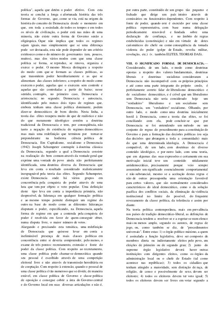 6. 6. política", aquela que detém o poder efetivo. Com esta por outra parte, constituído de um grupo tão pequeno eteoria se conclui a longa e afortunada história das três fechado que dirige um país inteiro através deformas de Governo, que, como se viu, está na origem da comissários ou funcionários dependentes. Com respeito àhistória do conceito de Democracia desde o momento em fonte de poder, quando este é exercido por uma classeque, em toda a sociedade, de todos os tempos e em todos política representativa, com base numa delegaçãoos níveis de civilização, o poder está nas mãos de uma periodicamente renovável e fundada sobre umaminoria, não existe outra forma de Governo senão a declaração de confiança, e no âmbito de regrasoligárquica. Oque não implica que todos os regimes estabelecidas (constituição) e não em virtude de dotessejam iguais, mas simplesmente que se uma diferença carismáticos do chefe ou como conseqüência da tomadapode ser destacada, esta não pode depender de um critério violenta do poder (golpe de Estado, revolta militar,extrínseco como o do número de governantes (um, poucos, revolução, etc.) (v. também ELITES, TEORIAS DAS).muitos), mas dos vários modos com que uma classepolítica se forma, se reproduz, se renova, organiza e VIII. O SIGNIFICADO FORMAL DE DEMOCRACIA.—exerce o poder. O mesmo Mosca distinguiu a respeito Considerando, de um lado, o modo como doutrinasdo modo com que se formam as classes políticas, as opostas a respeito dos valores fundamentais, doutrinasque transmitem poder hereditariamente e as que se liberais e doutrinas socialistas consideraram aalimentam das classes inferiores; a respeito do modo como Democracia não incompatível com os próprios princípiosexercem o poder, aquelas que o exercem sem controle e e até como uma parte integrante do próprio credo, éaquelas que são controladas a partir de baixo; nesse perfeitamente correto falar de liberalismo democrático esentido, contrapôs, no primeiro caso, Democracia e de socialismo democrático, e é crível que um liberalismoaristocracia; no segundo. Democracia e autocracia, sem Democracia não seria considerado hoje umidentificando pelo menos dois tipos de regimes que, "verdadeiro" liberalismo e um socialismo semembora tenham uma classe política dominante, podem Democracia, um "verdadeiro" socialismo. Olhando, pordizer-se democráticos de bom direito. Nesta linha, a outro lado, o modo como uma doutrina inicialmenteteoria das elites recupera muito do que de realístico e não hostil à Democracia, como a teoria das elites, se foido que meramente ideológico contém a doutrina conciliando com ela, pode concluir-se que portradicional da Democracia e tem, por conseqüência, não Democracia se foi entendendo um método ou umtanto a negação de existência de regimes democráticos conjunto de regras de procedimento para a constituição demas mais uma redefinição que terminou por tornar-se Governo e para a formação das decisões políticas (ou sejapreponderante na hodierna ciência política de das decisões que abrangem a toda a comunidade) maisDemocracia. Em Capitalismo, socialismo e Democracia do que uma determinada ideologia. A Democracia é(1942) Joseph Schumpeter contrapõe à doutrina clássica compatível, de um lado, com doutrinas de diversoda Democracia, segundo a qual a Democracia consiste conteúdo ideológico, e por outro lado, com uma teoria,na realização do bem comum através da vontade geral que que em algumas das suas expressões e certamente em suaexprime uma vontade do povo ainda não perfeitamente motivação inicial teve um conteúdo nitidamenteidentificada, uma doutrina diversa da Democracia que antidemocrático, precisamente porque veio sempreleva em conta o resultado considerado realisticamente assumindo um significado essencialmente comportamentalinexpugnável pela teoria das elites. Segundo Schumpeter, e não substancial, mesmo se a aceitação destas regras eexiste Democracia onde há vários grupos em não de outras pressuponha uma orientação favorávelconcorrência pela conquista do poder através de uma para certos valores, que são normalmente consideradosluta que tem por objeto o voto popular. Uma definição característicos do ideal democrático, como o da soluçãodeste tipo leva em conta a importância primária, não pacífica dos conflitos sociais, da eliminação da violênciadesprezível, da liderança em qualquer formação política institucional no limite do possível, do frequentee ao mesmo tempo permite distinguir um regime do revezamento da classe política, da tolerância e assim poroutro na base do modo como as diferentes lideranças diante.disputam o poder, especificando, na Democracia, aquela Na teoria política contemporânea, mais em prevalênciaforma de regime em que a contenda pela conquista do nos países de tradição democrático-liberal, as definições depoder é resolvida em favor de quem conseguir obter, Democracia tendem a resolver-se e a esgotar-se num elenconuma disputa livre, o maior número de votos. mais ou menos amplo, segundo os autores, de regras deAlargando e precisando esta temática, uma redefinição jogo, ou, como também se diz, de "procedimentosde Democracia que quisesse levar em conta a universais". Entre estas: 1) o órgão político máximo, a quemineliminável presença de mais classes políticas em é assinalada a função legislativa, deve ser composto deconcorrência entre si deveria compreender, pelo menos, o membros direta ou indiretamente eleitos pelo povo, emexame de três pontos: recrutamento, extensão e fonte do eleições de primeiro ou de segundo grau; 2) junto dopoder da classe política. Com respeito ao recrutamento, supremo órgão legislativo deverá haver outrasuma classe política pode chamar-se democrática quando instituições com dirigentes eleitos, como os órgãos daseu pessoal é escolhido através de uma competição administração local o