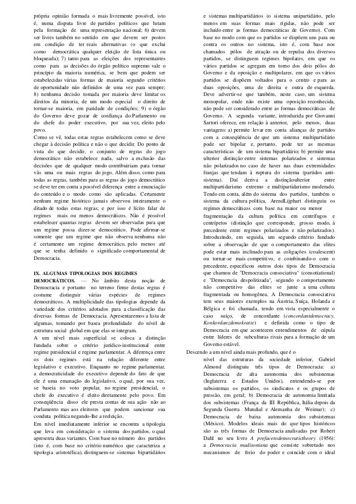 7. 7. própria opinião formada o mais livremente possível, isto e sistemas multipartidários (o sistema unipartidário, peloé, numa disputa livre de partidos políticos que lutam menos em suas formas mais rígidas, não pode serpela formação de uma representação nacional; 6) devem incluído entre as formas democráticas de Governo). Comser livres também no sentido em que devem ser postos base no modo com que os partidos se dispõem uns para ouem condição de ter reais alternativas (o que exclui contra os outros no sistema, isto é, com base noscomo democrática qualquer eleição de lista única ou chamados pólos de atração ou de repulsa dos diversosbloqueada); 7) tanto para as eleições dos representantes partidos, se distinguem regimes bipolares, em que oscomo para as decisões do órgão político supremo vale o vários partidos se agregam em torno dos dois pólos doprincípio da maioria numérica, se bem que podem ser Governo e da oposição e multipolares, em que os váriosestabelecidas várias formas de maioria segundo critérios partidos se dispõem voltados para o centro e para asde oportunidade não definidos de uma vez para sempre; duas oposições, uma de direita e outra de esquerda.8) nenhuma decisão tomada por maioria deve limitar os Deve advertir-se que também, neste caso, um sistemadireitos da minoria, de um modo especial o direito de monopolar, onde não existe uma oposição reconhecida,tornar-se maioria, em paridade de condições; 9) o órgão não pode ser considerado entre as formas democráticas dedo Governo deve gozar de confiança do Parlamento ou Governo. A segunda variante, introduzida por Giovannido chefe do poder executivo, por sua vez, eleito pelo Sartori oferece, em relação à anterior, pelo menos, duaspovo. vantagens: a) permite levar em conta alianças de partidosComo se vê, todas estas regras estabelecem como se deve com a conseqüência de que um sistema multipartidáriochegar à decisão política e não o que decidir. Do ponto de pode ser bipolar e, portanto, pode ter as mesmasvista do que decidir, o conjunto de regras do jogo características de um sistema bipartidário; b) permite umademocrático não estabelece nada, salvo a exclusão das ulterior distinção entre sistemas polarizados e sistemasdecisões que de qualquer modo contribuiriam para tornar não polarizados no caso de haver nas duas extremidadesvãs uma ou mais regras do jogo. Além disso, como para franjas que tendam à ruptura do sistema (partidos anti-todas as regras, também para as regras do jogo democrático sistema). Daí deriva a distinçãoulterior entrese deve ter em conta a possível diferença entre a enunciação multipartidarismo extremo e multipartidarismo moderado.do conteúdo e o modo como são aplicadas. Certamente Tendo em conta, além do sistema dos partidos, também onenhum regime histórico jamais observou inteiramente o sistema da cultura política, ArendLijphart distinguiu osditado de todas estas regras; e por isso é lícito falar de regimes democráticos com base na maior ou menorregimes mais ou menos democráticos. Não é possível fragmentação da cultura política em centrífugos eestabelecer quantas regras devem ser observadas para que centrípetos (distinção que corresponde, grosso modo, àum regime possa dizer-se democrático. Pode afirmar-se precedente entre regimes polarizados e não polarizados).somente que um regime que não observa nenhuma não Introduzindo, em seguida, um segundo critério fundadoé certamente um regime democrático, pelo menos até sobre a observação de que o comportamento das elitesque se tenha definido o significado comportamental de pode estar mais inclinado para as coligações (coalescent)Democracia. ou tornar-se mais competitivo, e combinando-o com o precedente, especificou outros dois tipos de DemocraciaIX. ALGUMAS TIPOLOGIAS DOS REGIMES que chamou de "Democracia consociativa" (consotiational)DEMOCRÁTICOS. — No âmbito desta noção de e "Democracia despolitizada", segundo o comportamentoDemocracia e portanto no terreno firme destas regras é não competitivo das elites se junte a uma culturacostume distinguir várias espécies de regimes fragmentada ou homogênea. A Democracia consociativademocráticos. A multiplicidade das tipologias depende da tem seus maiores exemplos na Áustria, Suíça, Holanda evariedade dos critérios adotados para a classificação das Bélgica e foi chamada, tendo em vista especialmente odiversas formas de Democracia. Apresentaremos a lista de caso suíço, de concordante (concordantdemocracy,algumas, tomando por basea profundidade do nível de Konkordanzdemokratie) e definida como o tipo deestrutura social global em que elas se integram. Democracia em que acontecem entendimentos de cúpulaA um nível mais superficial se coloca a distinção entre líderes de subculturas rivais para a formação de umfundada sobre o critério jurídico-institucional entre Governo estável.regime presidencial e regime parlamentar. A diferença entre Descendo a um nível ainda mais profundo, que é oos dois regimes está na relação diferente entre nível das estruturas da sociedade inferior, Gabriellegislativo e executivo. Enquanto no regime parlamentar, Almond distinguiu três tipos de Democracia: a)a democraticidade do executivo depende do fato de que Democracia de alta autonomia dos subsistemasele é uma emanação do legislativo, o qual, por sua vez, (Inglaterra e Estados Unidos), entendendo-se porse baseia no voto popular, no regime presidencial, o subsistemas os partidos, os sindicatos e os grupos dechefe do executivo é eleito diretamente pelo povo. Em pressão, em geral; b) Democracia de autonomia limitadaconseqüência disso ele presta contas de sua ação não ao dos subsistemas (França da III República, Itália depois daParlamento mas aos eleitores que podem sancionar sua Segunda Guerra Mundial e Alemanha de Weimar); c)conduta política negando-lhe a reeleição. Democracia de