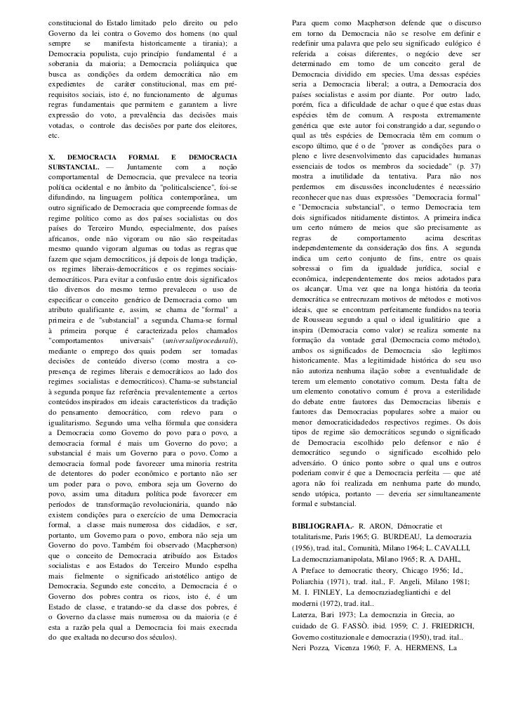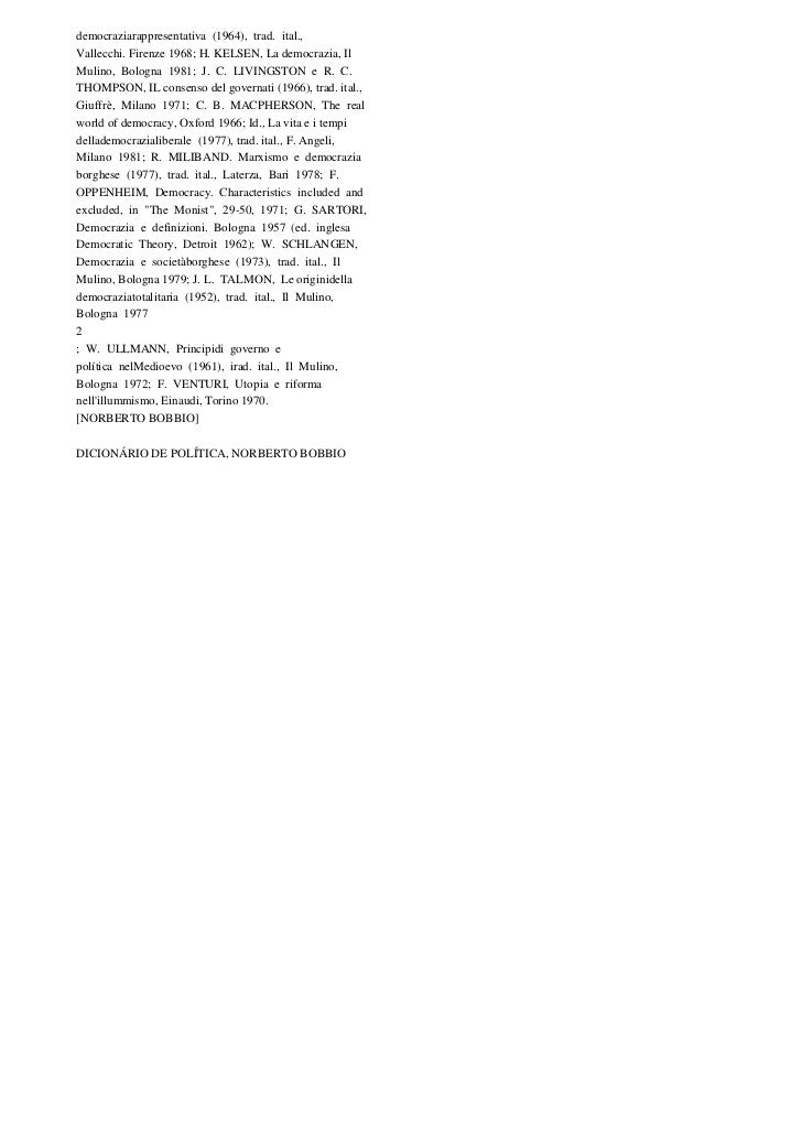 9. 9. democraziarappresentativa (1964), trad. ital.,Vallecchi. Firenze 1968; H. KELSEN, La democrazia, IlMulino, Bologna 1981; J. C. LIVINGSTON e R. C.THOMPSON, IL consenso del governati (1966), trad. ital.,Giuffrè, Milano 1971; C. B. MACPHERSON, The realworld of democracy, Oxford 1966; Id., La vita e i tempidellademocrazialiberale (1977), trad. ital., F. Angeli,Milano 1981; R. MILIBAND. Marxismo e democraziaborghese (1977), trad. ital., Laterza, Bari 1978; F.OPPENHEIM, Democracy. Characteristics included andexcluded, in "The Monist", 29-50, 1971; G. SARTORI,Democrazia e definizioni. Bologna 1957 (ed. inglesaDemocratic Theory, Detroit 1962); W. SCHLANGEN,Democrazia e societàborghese (1973), trad. ital., IlMulino, Bologna 1979; J. L. TALMON, Le originidellademocraziatotalitaria (1952), trad. ital., Il Mulino,Bologna 19772; W. ULLMANN, Principidi governo epolítica nelMedioevo (1961), irad. ital., Il Mulino,Bologna 1972; F. VENTURI, Utopia e riformanellillummismo, Einaudi, Torino 1970.[NORBERTO BOBBIO]DICIONÁRIO DE POLÍTICA, NORBERTO BOBBIO