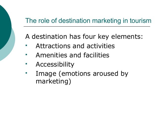 2. 2. The role of destination marketing in tourism A destination has four key elements:  Attractions and activities  Amenities and facilities  Accessibility  Image (emotions aroused by marketing)