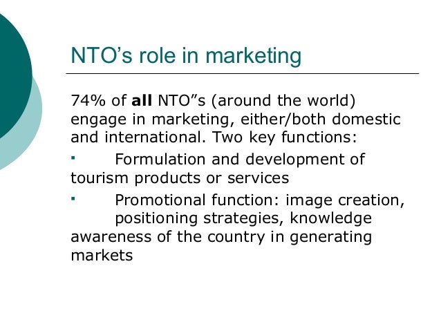 4. 4. NTO’s role in marketing 74% of all NTO”s (around the world) engage in marketing, either/both domestic and international. Two key functions:  Formulation and development of tourism products or services  Promotional function: image creation, positioning strategies, knowledge awareness of the country in generating markets