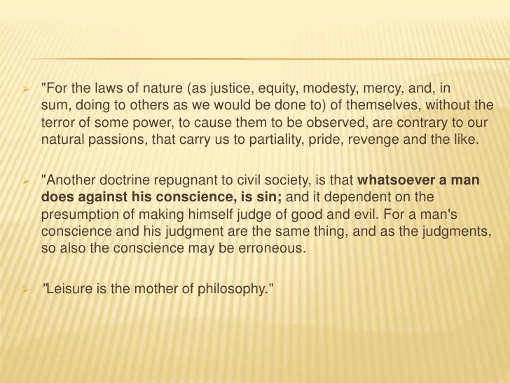 10. 10.  "For the laws of nature (as justice, equity, modesty, mercy, and, in sum, doing to others as we would be done to) of themselves, without the terror of some power, to cause them to be observed, are contrary to our natural passions, that carry us to partiality, pride, revenge and the like. "Another doctrine repugnant to civil society, is that whatsoever a man does against his conscience, is sin; and it dependent on the presumption of making himself judge of good and evil. For a mans conscience and his judgment are the same thing, and as the judgments, so also the conscience may be erroneous. "Leisure is the mother of philosophy."