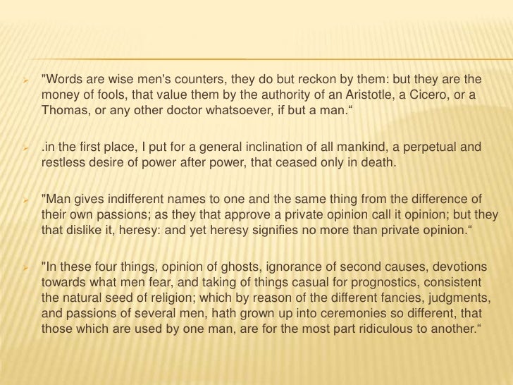 11. 11.  "Words are wise mens counters, they do but reckon by them: but they are the money of fools, that value them by the authority of an Aristotle, a Cicero, or a Thomas, or any other doctor whatsoever, if but a man.“ .in the first place, I put for a general inclination of all mankind, a perpetual and restless desire of power after power, that ceased only in death. "Man gives indifferent names to one and the same thing from the difference of their own passions; as they that approve a private opinion call it opinion; but they that dislike it, heresy: and yet heresy signifies no more than private opinion.“ "In these four things, opinion of ghosts, ignorance of second causes, devotions towards what men fear, and taking of things casual for prognostics, consistent the natural seed of religion; which by reason of the different fancies, judgments, and passions of several men, hath grown up into ceremonies so different, that those which are used by one man, are for the most part ridiculous to another.“