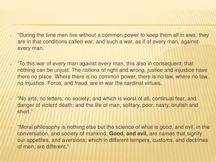 12. 12.  "During the time men live without a common power to keep them all in awe, they are in that conditions called war; and such a war, as if of every man, against every man. "To this war of every man against every man, this also in consequent; that nothing can be unjust. The notions of right and wrong, justice and injustice have there no place. Where there is no common power, there is no law, where no law, no injustice. Force, and fraud, are in war the cardinal virtues. "No arts; no letters; no society; and which is worst of all, continual fear, and danger of violent death: and the life of man, solitary, poor, nasty, brutish and short.“ "Moral philosophy is nothing else but the science of what is good, and evil, in the conversation, and society of mankind. Good, and evil, are names that signify our appetites, and aversions; which in different tempers, customs, and doctrines of men, are different."