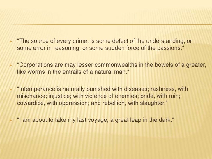 13. 13.  "The source of every crime, is some defect of the understanding; or some error in reasoning; or some sudden force of the passions.“ "Corporations are may lesser commonwealths in the bowels of a greater, like worms in the entrails of a natural man.“ "Intemperance is naturally punished with diseases; rashness, with mischance; injustice; with violence of enemies; pride, with ruin; cowardice, with oppression; and rebellion, with slaughter.“ "I am about to take my last voyage, a great leap in the dark."
