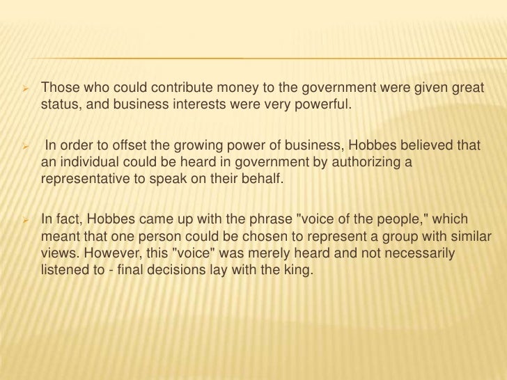 14. 14.  Those who could contribute money to the government were given great status, and business interests were very powerful. In order to offset the growing power of business, Hobbes believed that an individual could be heard in government by authorizing a representative to speak on their behalf. In fact, Hobbes came up with the phrase "voice of the people," which meant that one person could be chosen to represent a group with similar views. However, this "voice" was merely heard and not necessarily listened to - final decisions lay with the king.