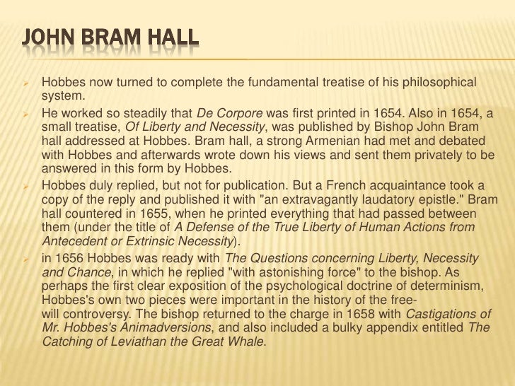 15. 15. JOHN BRAM HALL Hobbes now turned to complete the fundamental treatise of his philosophical system. He worked so steadily that De Corpore was first printed in 1654. Also in 1654, a small treatise, Of Liberty and Necessity, was published by Bishop John Bram hall addressed at Hobbes. Bram hall, a strong Armenian had met and debated with Hobbes and afterwards wrote down his views and sent them privately to be answered in this form by Hobbes. Hobbes duly replied, but not for publication. But a French acquaintance took a copy of the reply and published it with "an extravagantly laudatory epistle." Bram hall countered in 1655, when he printed everything that had passed between them (under the title of A Defense of the True Liberty of Human Actions from Antecedent or Extrinsic Necessity). in 1656 Hobbes was ready with The Questions concerning Liberty, Necessity and Chance, in which he replied "with astonishing force" to the bishop. As perhaps the first clear exposition of the psychological doctrine of determinism, Hobbess own two pieces were important in the history of the free- will controversy. The bishop returned to the charge in 1658 with Castigations of Mr. Hobbess Animadversions, and also included a bulky appendix entitled The Catching of Leviathan the Great Whale.