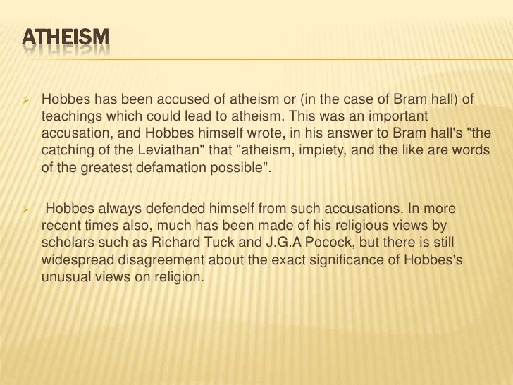17. 17. ATHEISM Hobbes has been accused of atheism or (in the case of Bram hall) of teachings which could lead to atheism. This was an important accusation, and Hobbes himself wrote, in his answer to Bram halls "the catching of the Leviathan" that "atheism, impiety, and the like are words of the greatest defamation possible". Hobbes always defended himself from such accusations. In more recent times also, much has been made of his religious views by scholars such as Richard Tuck and J.G.A Pocock, but there is still widespread disagreement about the exact significance of Hobbess unusual views on religion.