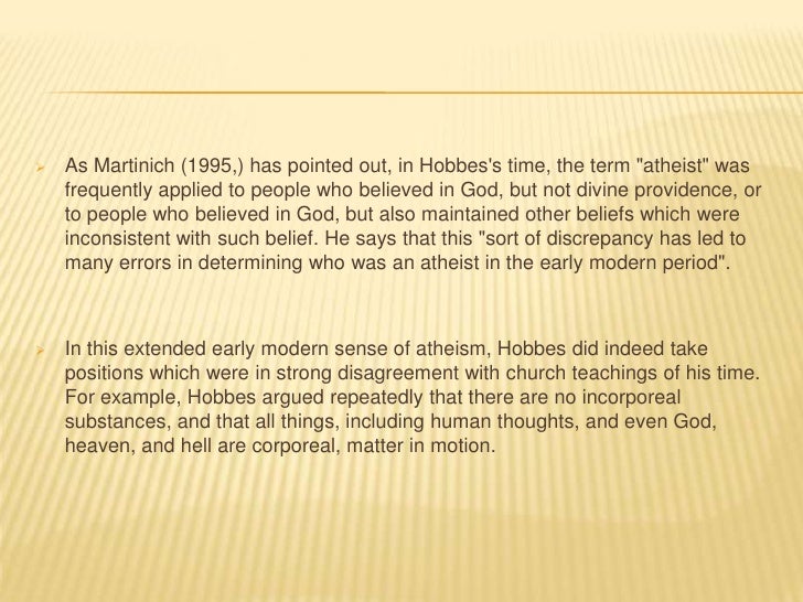 18. 18.  As Martinich (1995,) has pointed out, in Hobbess time, the term "atheist" was frequently applied to people who believed in God, but not divine providence, or to people who believed in God, but also maintained other beliefs which were inconsistent with such belief. He says that this "sort of discrepancy has led to many errors in determining who was an atheist in the early modern period". In this extended early modern sense of atheism, Hobbes did indeed take positions which were in strong disagreement with church teachings of his time. For example, Hobbes argued repeatedly that there are no incorporeal substances, and that all things, including human thoughts, and even God, heaven, and hell are corporeal, matter in motion.
