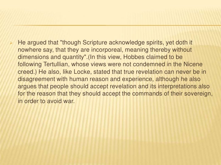 19. 19.  He argued that "though Scripture acknowledge spirits, yet doth it nowhere say, that they are incorporeal, meaning thereby without dimensions and quantity".(In this view, Hobbes claimed to be following Tertullian, whose views were not condemned in the Nicene creed.) He also, like Locke, stated that true revelation can never be in disagreement with human reason and experience, although he also argues that people should accept revelation and its interpretations also for the reason that they should accept the commands of their sovereign, in order to avoid war.